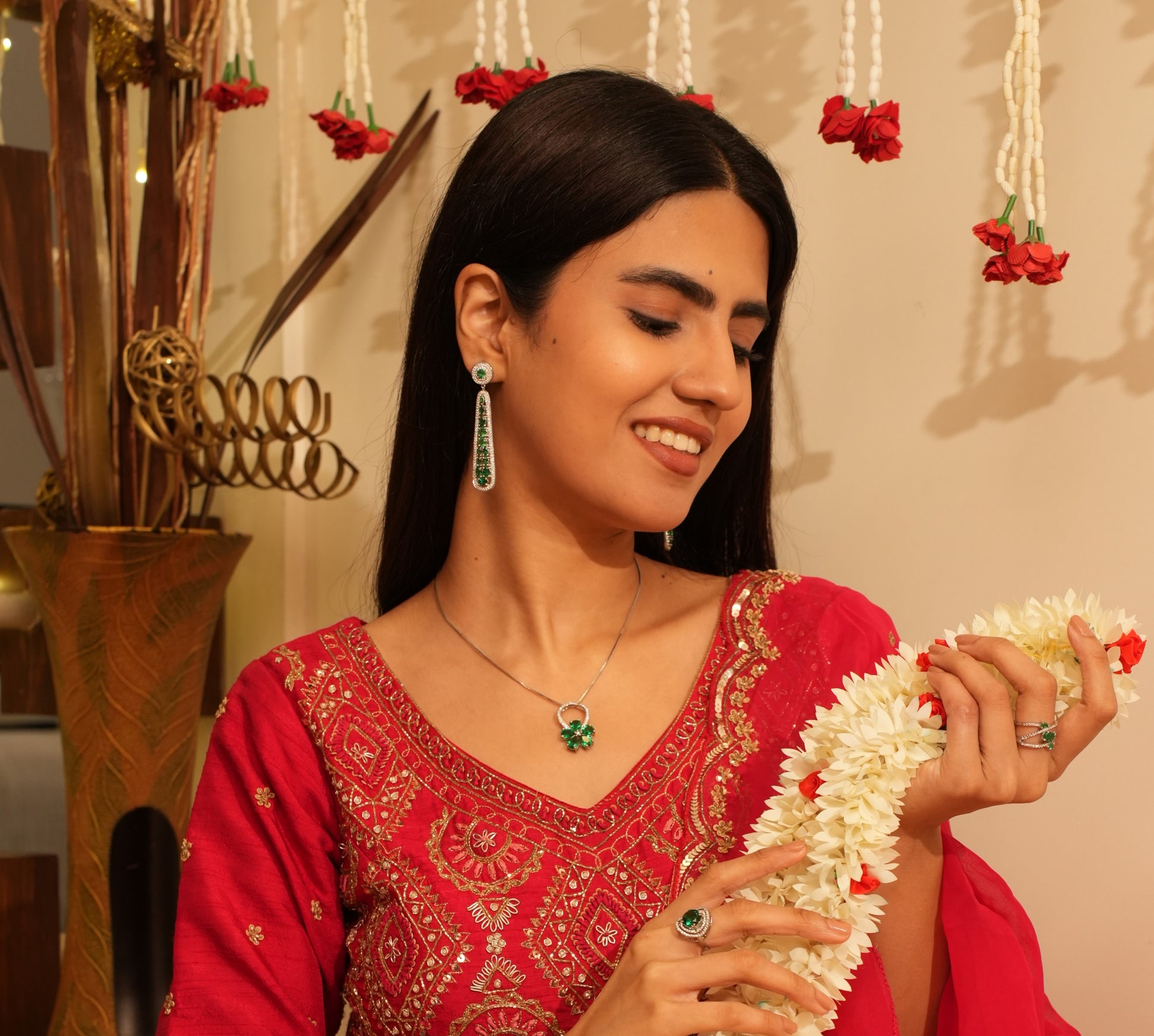 Defined by vivid green stones and refined silhouettes, the collection brings together circular blooms, cascading drops, and statement cuts. Each Piece is designed to complement festive occasions, adding a touch of sophistication and depth to every look.