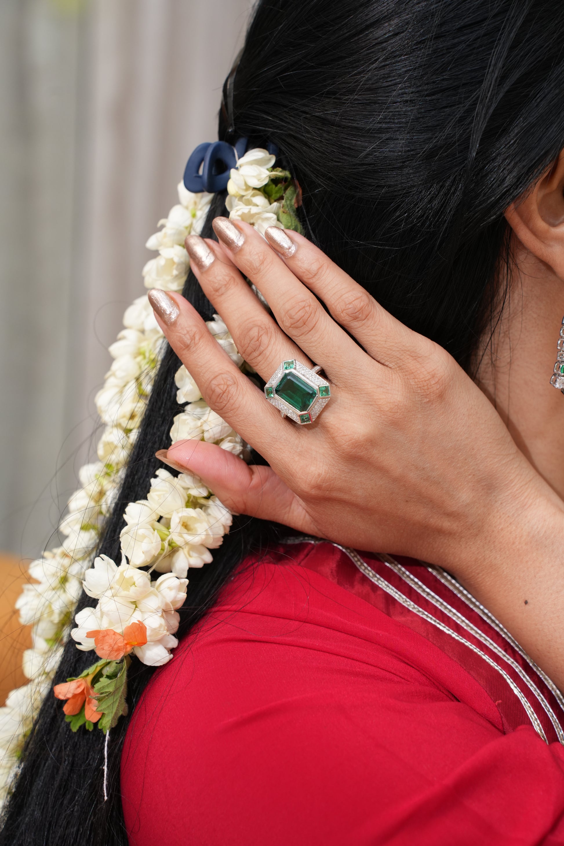 Defined by vivid green stones and refined silhouettes, the collection brings together circular blooms, cascading drops, and statement cuts. Each Piece is designed to complement festive occasions, adding a touch of sophistication and depth to every look.