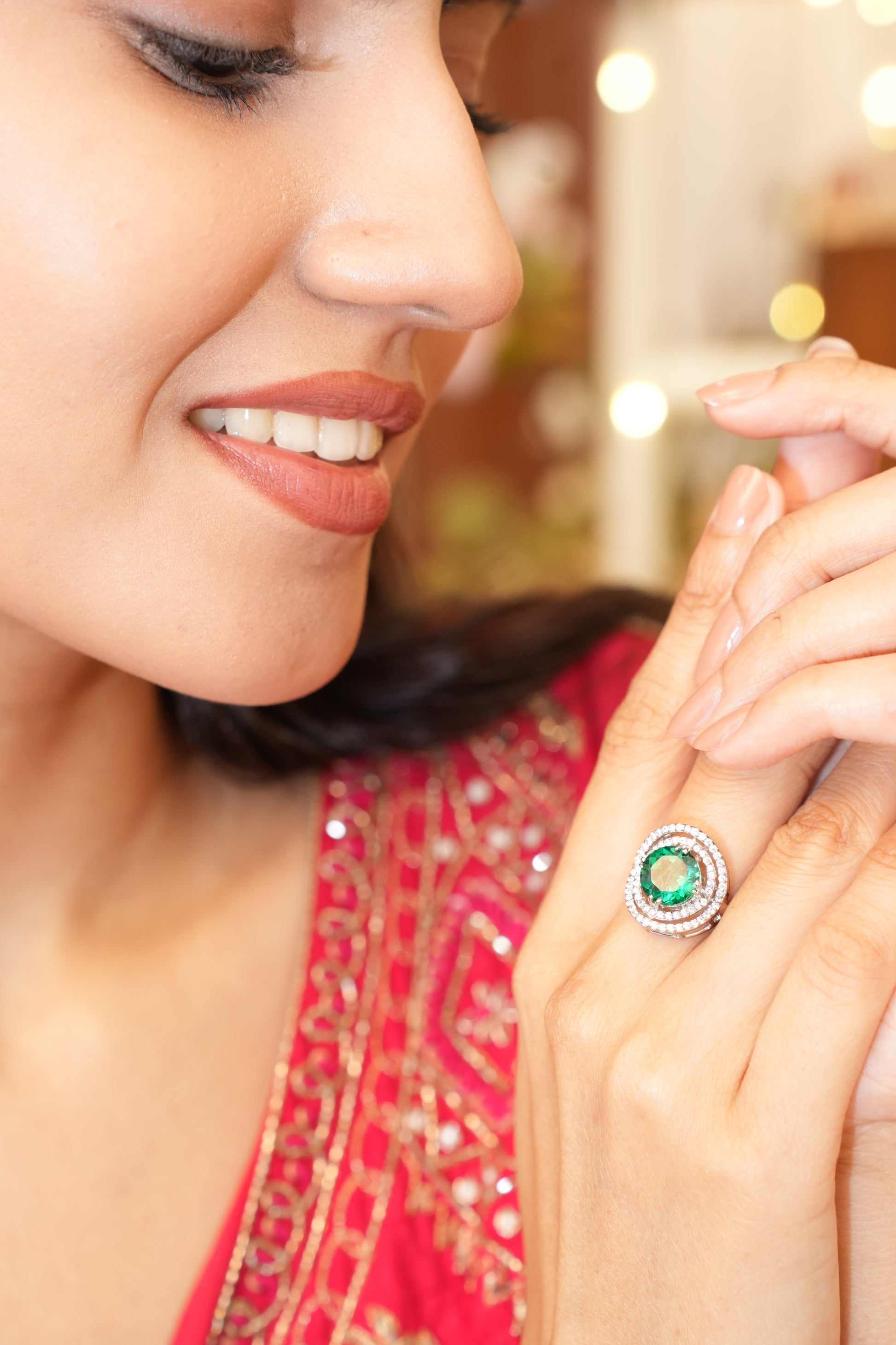 Defined by vivid green stones and refined silhouettes, the collection brings together circular blooms, cascading drops, and statement cuts. Each Piece is designed to complement festive occasions, adding a touch of sophistication and depth to every look.